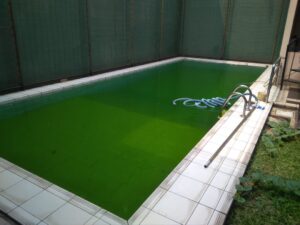 Kolam renang yang tidak bersih atau kotor akan menambah dosis pemberian obatnya, kolam yang tidak bersih atau kotor yang berwarna hijau, membutuhkan penambahan obat yang lebih banyak dari biasanya. Untuk takaran obat kolam renang yang berwarna hijau membutuhkan analisa seberapa parah dan seberapa luas kolam renang