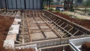 Sebuah jaringan besi tulangan yang dipasang di dalam cetakan beton kolam, itulah pembesian kolam renang. Rangkaian besi ini berfungsi sebagai “tulang” yang akan menopang seluruh beban air dan tekanan tanah di sekeliling kolam. Sebelum dicor dengan beton, batang-batang baja pembesian yang diikat bersama membentuk pola kisi-kisi.